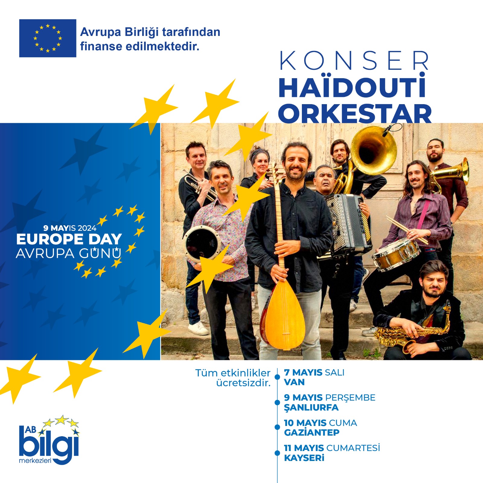 Haïdouti Orkestrası, 9 Mayıs Avrupa Günü kapsamında 7-11 Mayıs tarihleri arasında Türkiye’de bir dizi konser vermeye hazırlanıyor. Fransa, Yunanistan, Türkiye, Romanya ve Sırbistan gibi farklı ülkelerden müzisyenlerin oluşturduğu topluluk ilk konserini Van’da daha sonra sırasıyla Şanlıurfa, Gaziantep ve Kayseri’de dinleyicilerle buluşacak.