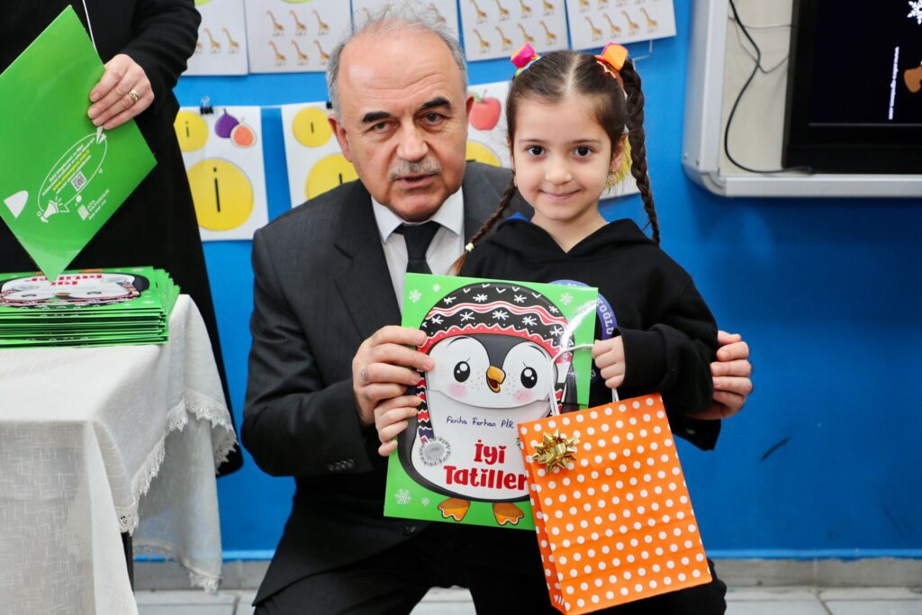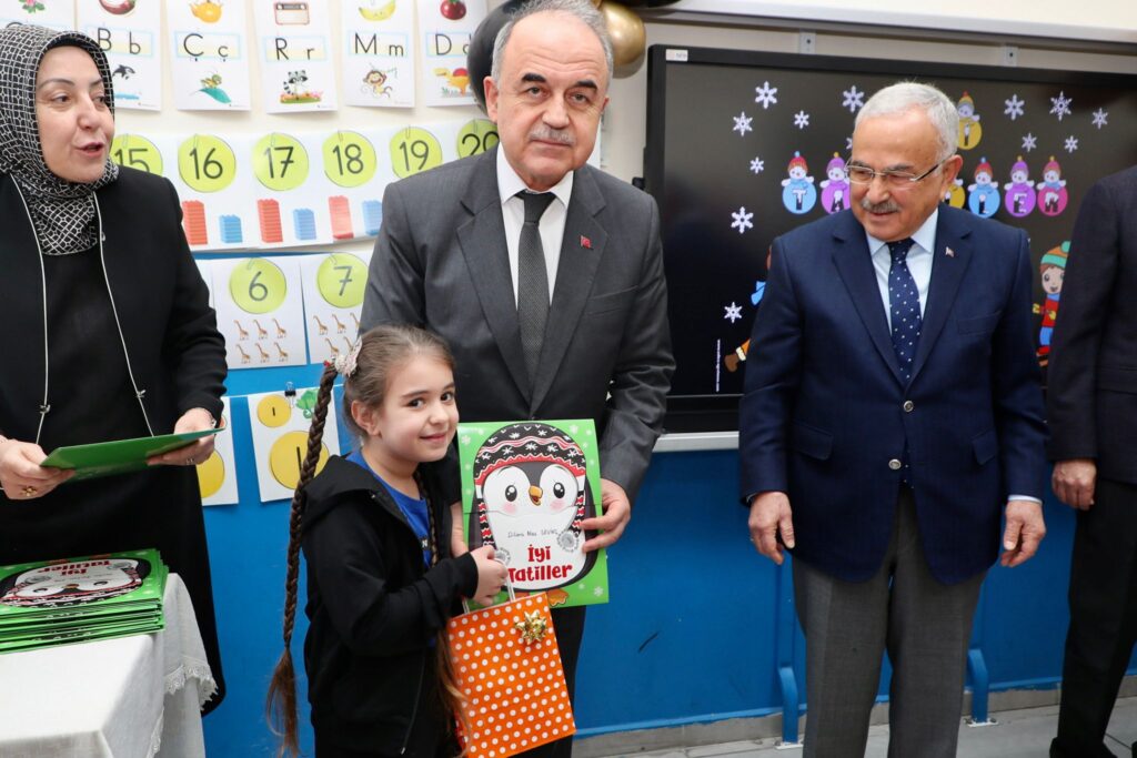 1/D sınıfında, protokol üyeleri ile birlikte öğrencilere karnelerini veren Vali Muammer Erol, öğrencilere iyi tatiller diledi ve onlarla bir süre sohbette bulundu.